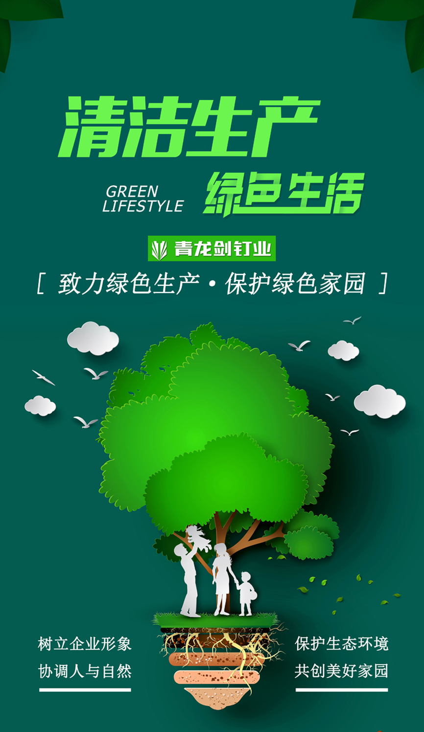 青龍劍釘業有限公司在飛速發展的同時,公司勇于擔當社會責任,積極響應“節能減排、保護環境、做規范型企業”,公司不斷加大環保資金投入以及環保設備的升級改造,按照國家標準嚴格落實。