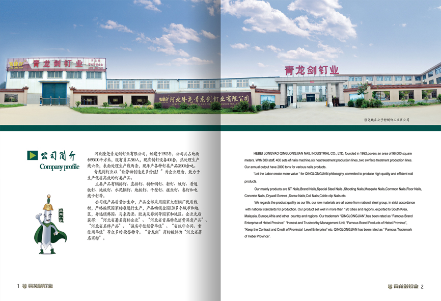 河北隆堯青龍劍釘業(yè)有限公司,始建于1992年,公司共占地面積96000平方米,現(xiàn)有員工380人,現(xiàn)有制釘設備400套,熱處理生產線六條,表面處理生產線兩條,現(xiàn)年產各種釘類產品28000余噸。